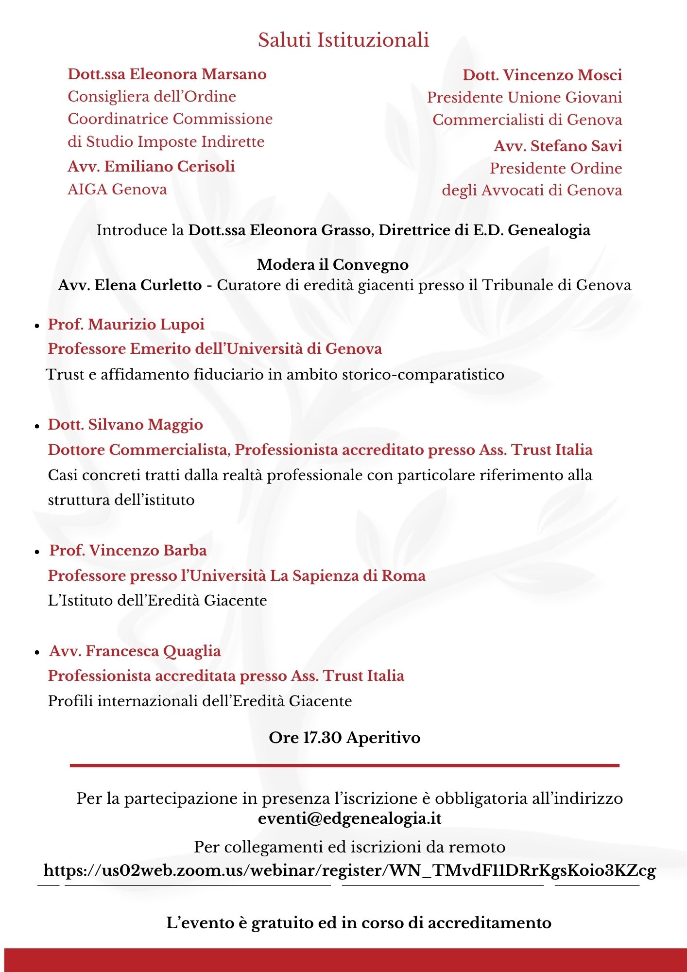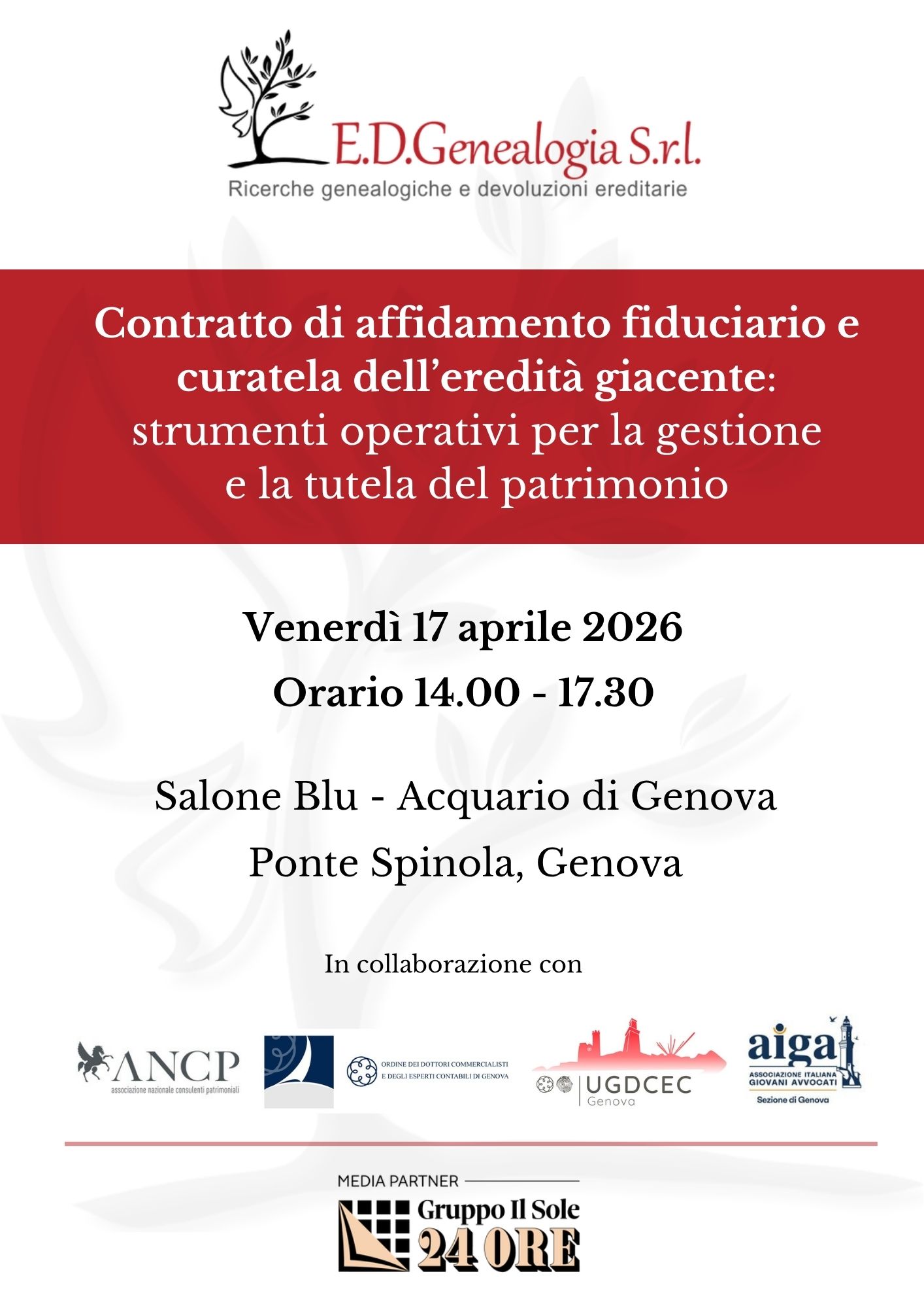 Il 17 aprile 2026 sarò relatore a Genova in un convegno dedicato all’affidamento fiduciario e alla curatela dell’eredità giacente, con casi concreti sulla tutela delle famiglie, anche con membri vulnerabili.